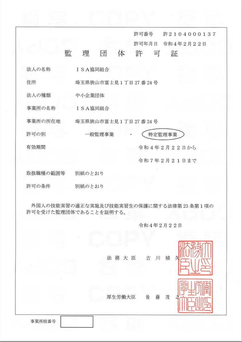 令和4年2月22日にISA協同組合の監理団体許可証を交付いただきました。